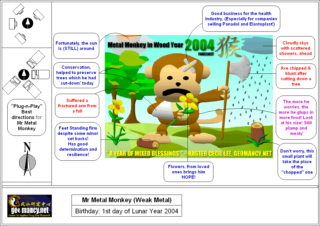 2004 is the Year of Monkey, where the Heavenly Stem of the Year is Wood while Earthly branch is Metal. When Metal Monkey attempts to chop tress, the monkey has both gains and injuries. So some difficulties can be expected.Learn more about what Cecil has to say about this illustrated forecast!